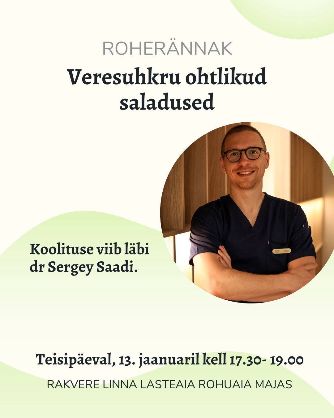13. jaanuaril kell 17.30- 19.00 toimub Rakvere Linna Lasteaia Rohuaia maja saalis tervise teemaline roherännak “Veresuhkru ohtlikud saladused”. Koolituse viib läbi dr Sergey Saadi.